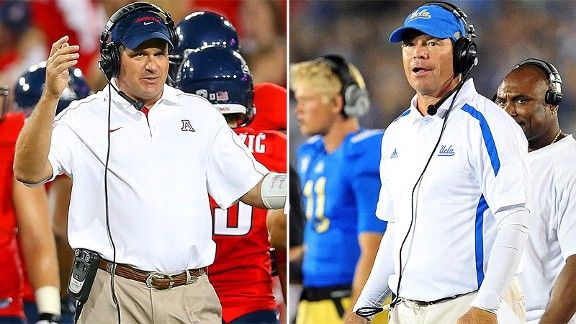 That said, Rich Rodriguez & his team are carrying their own demons into the game tomorrow. In his three years at Arizona Rodriguez & his staff have won two-thirds of their games against PAC-12 South opponents not hailing from Westwood. UCLA is the only Southern division school Arizona hasn't beaten in that time & it hasn't been close. The combined score of the three games the teams have played is an astounding 114-43. In the first two games the Wildcats held the lead for a mere seventeen seconds, & last year's game saw them drive for a touchdown on their opening drive & never score again. The sixty-six points UCLA scored in the first game is the most given up by Arizona in the Rich Rod era, & the aforementioned seven scored last year pales only in comparison to the shutout pitched by a third ranked Oregon team in Rich Rod's first PAC-12 game. To say Jim Mora's crew has bested Rodriguez's staff would be a massive understatement.